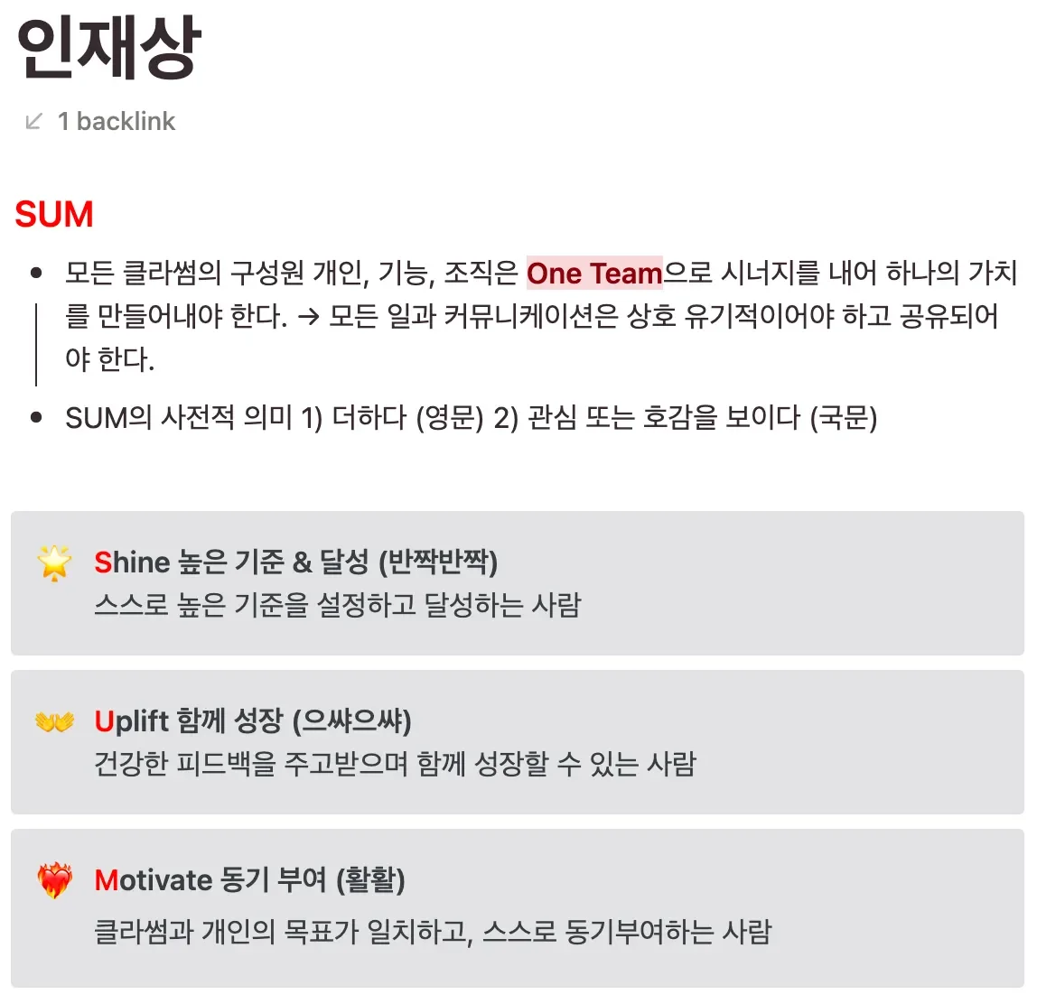 이를 위해 클라썸 또한 인재상(SUM)에서 개인과 팀의 성장의 목표가 일치해야 함을 강조하고 있어요.