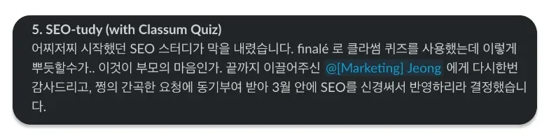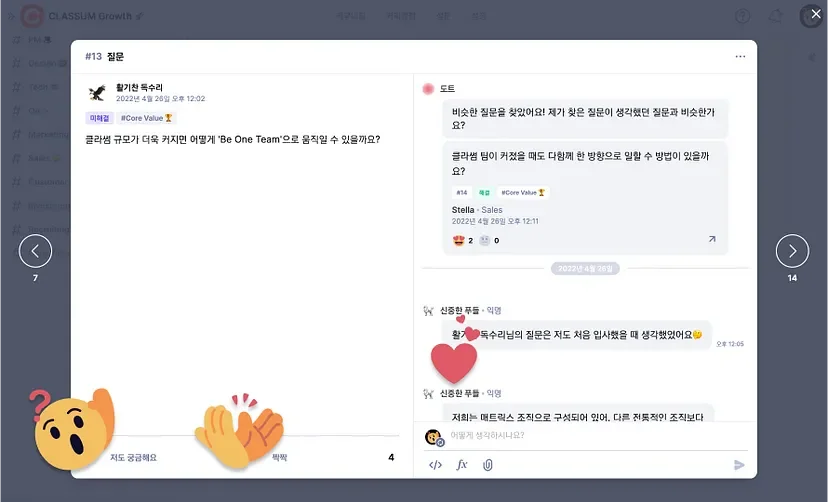 이모티콘을 통한 소통은 쉽고 빠르면서도, 팀원들에게 작은 심리적 보상을 주는 좋은 방법입니다. 클라썸에서는 쉽게 칭찬하고 반응할 수 있도록 이모티콘을 활용해요. 질문 혹은 지식 공유 글이 올라오면, 클라썸만의 이모티콘인 ‘썸모티콘’으로 칭찬을 표현합니다.