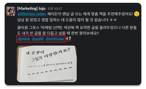 또한 모두가 조직의 방향성을 자연스럽게 흡수하도록 하기 위해, 다른 팀원을 핵심가치, 인재상 기반으로 칭찬하도록 권장합니다. @태그 형태로 만들어 사용하고 있어 팀원들은 조직의 방향성을 상시로 떠올릴 수 있어요.