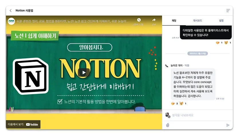영상 콘텐츠: 영상을 보고 질문을 남기도록 유도해보세요. 클라썸에서는 시간에 구애받지 않고 영상을 볼 수 있으면서도, 채팅 기록은 남아있어 팀원 간 지속적인 소통이 가능합니다.