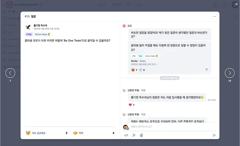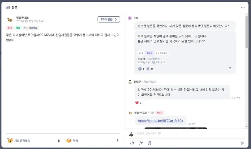 비슷한 질문을 찾아주는 AI 도트 기능이 있어 모든 질문에 관리자가 답변해줘야 하는 중복 업무는 줄여줍니다.