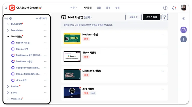 클라썸의 학습 공간. 팀별로 섹션을 나눈 모습.