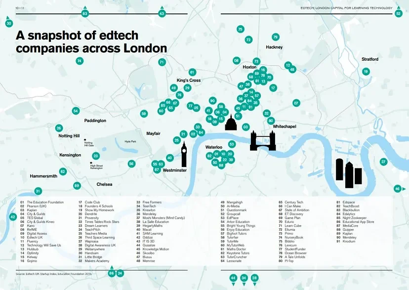 영국의 경우 에듀테크 시장 중에서 가장 빨리 성장한 곳 중 한 곳입니다. London&Partners, EdtechUK, 영국정부가 공동으로 제작한 보고서에 따르면 2015년 말 기준으로 1 천 곳이 넘는 수많은 에듀테크 관련 기업들이 영국에 존재하고 있으며 그중 200 여개의 업체는 런던에 있습니다. 영국 정부는 교육 시장에 큰 투자를 하고 있으며 따라서 교육과 관련된 기술에 대한 투자도 아끼지 않기 때문에 에듀테크 시장이 빠르게 발전할 수 있었고, 지금도 계속 발전하고 있습니다.