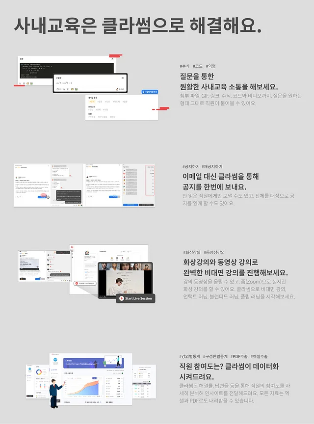클라썸은 별도의 서버나 환경 구축이 필요하지 않은 SaaS(Software as a Service,서비스로 제공되는 소프트웨어)이기 때문에 서비스의 도입과 실행이 용이합니다. 또한 기능 업데이트가 빠르고 유지 보수에도 고객사의 부담이 덜하다는 장점이 있습니다.