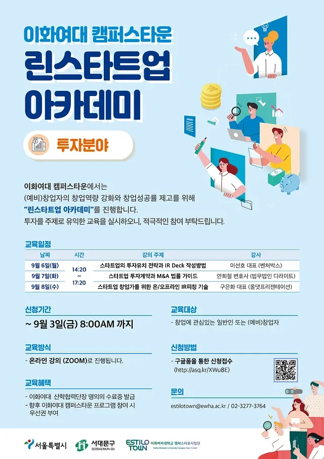 클라썸을 도입한 린스타트업 아카데미는 이화여대 캠퍼스타운 창업지원 분야의 창업교육 프로그램입니다. 창업성공률을 높이고, 사업 운영의 안정적 기반을 다질 수 있도록 투자와 마케팅을 주제로 구성해 2회차로 나누어 진행하였습니다. 입주기업을 비롯하여, 스타트업, 창업에 관심있는 일반인, 예비 창업자들까지 대상으로 폭넓게 진행하였습니다.