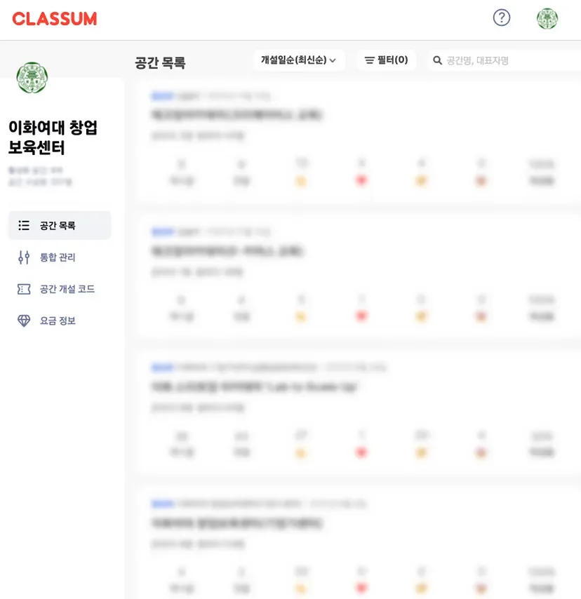 이화여대 창업보육센터와 캠퍼스타운 사업단에서는 클라썸에 기관 홈페이지처럼 사용할 수 있는 공간을 개설했습니다. 모든 부서가 프로그램을 홍보하고 활용할 수 있는 공간인데요. 프로그램별로 공간을 개설하고, 전체에게 공통 안내 사항을 전달할 수 있는 공간을 만들었습니다. 프로그램이 끝난 후에는 해당 공간에 가입을 안내해 사업단의 프로그램을 지속적으로 홍보하고 있습니다.