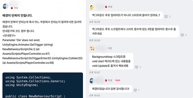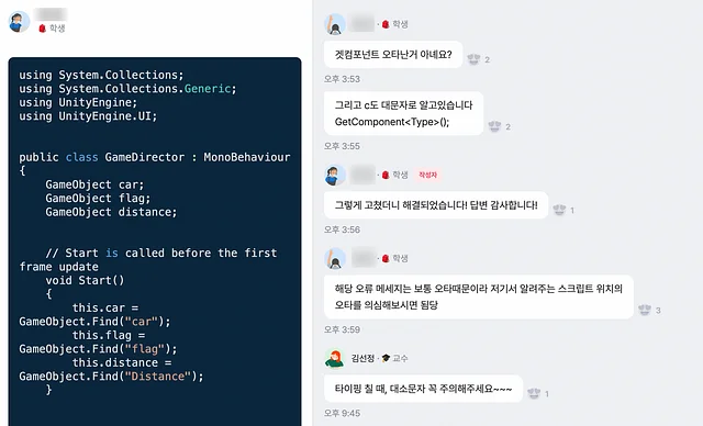 초보자인 학생들이 질문을 올리면 배경지식이 있던 학생들이 댓글을 많이 달아요. 예를 들어 프로그램 오류 메시지가 뜨면 그 화면을 캡처해 클라썸에 올리면서 ‘이게 안 돼요’, 하면 다른 학생이 ‘화면을 올려주세요’, ‘코드를 올려주세요’라고 하며 여러 가지로 의사소통 하는 걸 보고 편했습니다. 제가 일일이 답을 안 해도 학생들끼리 서로 주고받는구나! 하구요.
