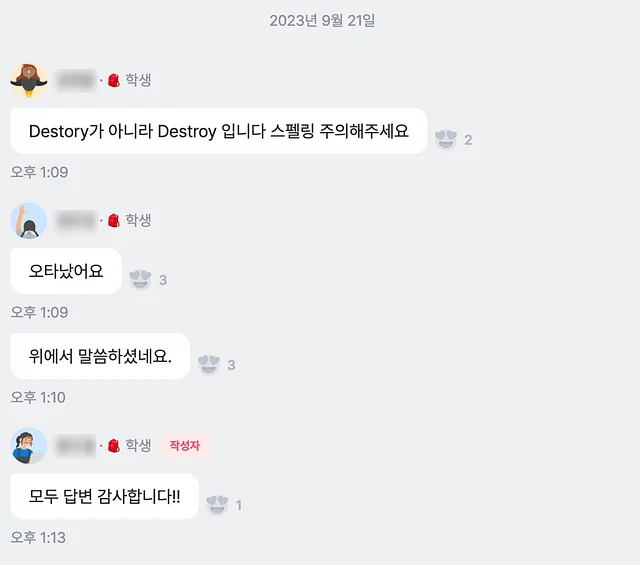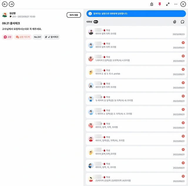 피드백 기능을 애용해요. 피드백 게시글을 활용해 그날 수업 시간에 중요했던 세 문제를 냅니다. 답을 올린 사람은 출석한 것이고 제출한 답변을 제가 읽어보면서 틀렸는지 확인을 할 수 있고, 학생들이 수업 내용을 이해했는지 알아볼 수 있어요.