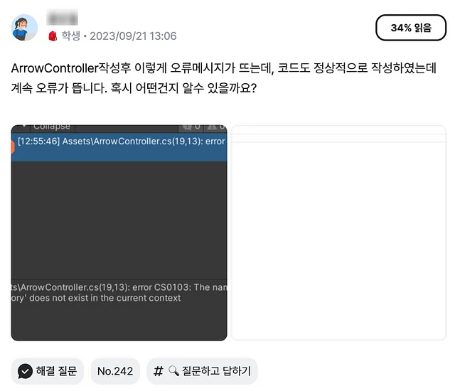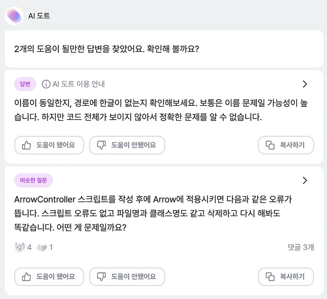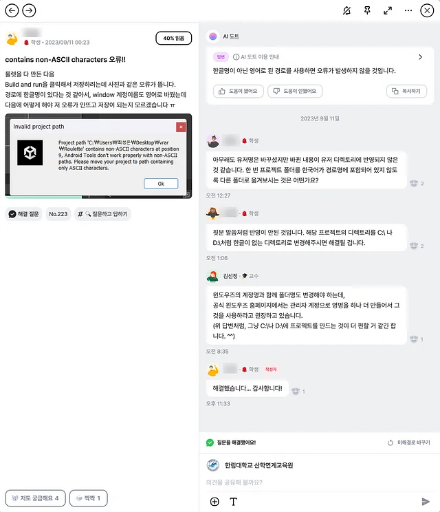 114명이 듣는 과목이 있는데 유니티라는 프로그램을 설치 해야 시작을 할 수 있거든요. 모든 소프트웨어가 그렇듯 컴퓨터마다 설치 오류가 있을 수 있는데요. 이에 대한 질문을 못 하는 친구들이 예전에는 많았는데, 지금은 다들 오류 메시지가 뜬 화면을 클라썸에 올립니다. 이에 대해 AI도트가 답변을 했는데 답변의 내용도 맞는 내용이라 인상 깊었어요.