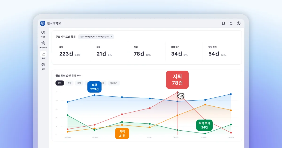 클라썸 커넥트는 단순 문의만 처리하는 챗봇이 아닙니다. 커넥트는 상담 중 '자퇴', '학업 포기' 등 위험 키워드가 발생하면 관리자 대시보드에 바로 기록하고 통계를 제공합니다. 학생의 이탈 신호를 조기에 포착하여 선제적인 학생 케어를 가능하게 합니다.