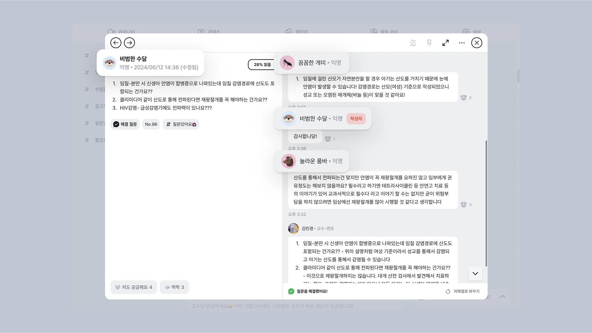 익명 기능을 활용해 상호작용에 대한 허들을 낮추고, 스스로 질문을 올리고 답변을 주고 받도록 유도했습니다. 학생들은 점차 서로 질문에 대한 답을 달아주며 자연스레 심화학습으로 이어졌습니다.
