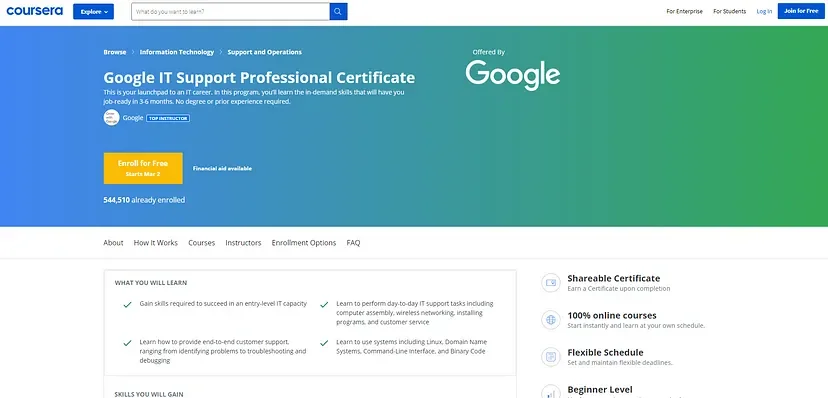 구글에서는 먼저 IT Support 분야 트레이닝 프로그램을 Coursera에서 제작하여 3–6개월 수강하여 수료할 수 있도록 했습니다. 이는 구글 뿐 아니라 다른 기업 취업에도 도움이 되는 분야이기도 합니다.