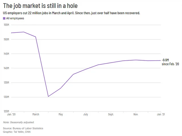 2020년 3월 기준으로 코로나19가 본격적으로 미국에서 퍼져나가면서 작년 3월과 4월 사이 약 2,200만 명의 실업자가 발생했습니다. 아직까지도 절반이 안되는 수준밖에 회복하지 못했는데요.