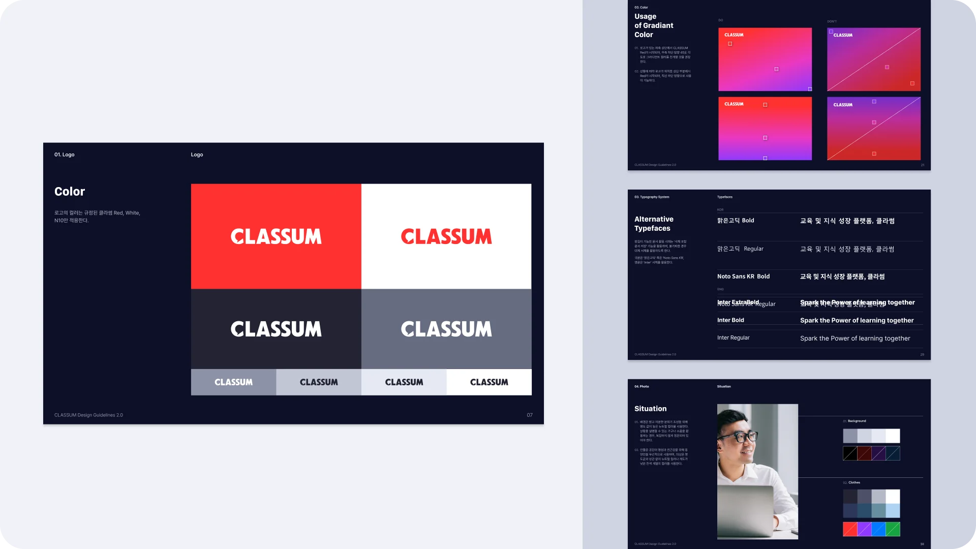 클라썸은 고객의 이해를 돕기 위해 대부분의 자료에 사진을 활용하고 있어요. 사진은 비주얼 커뮤니케이션에서 큰 임팩트를 주기 때문에, 보다 명확한 사용 가이드가 필요했습니다. 이에 클라썸 아이덴티티를 담은 사진이 무엇인지 명확하게 정의하고, 각 메테리얼에 어떻게 활용해야 하는지 상세한 가이드라인을 만들었어요. 인물의 표정, 의상, 배경, 구도 등을 정의하여, 직접 촬영하거나 스톡 이미지를 리서치할 때 기준으로 삼을 수 있게 했습니다. 최근에는 생성형 AI를 활용해 이미지를 제작하고 있는데, 가이드라인 덕분에 더 효율적으로 이미지를 제작할 수 있게 되었어요.