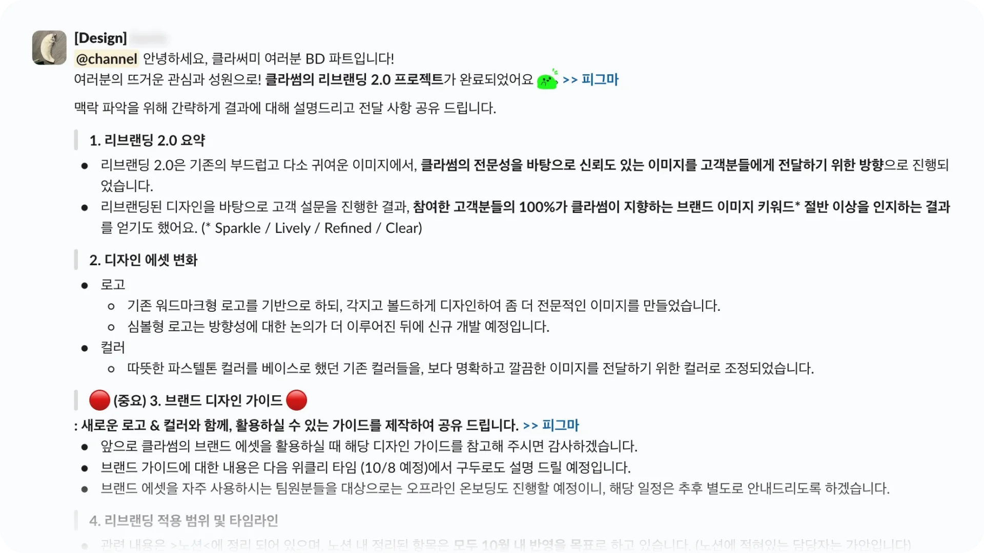 브랜드 디자인팀에서는 이를 해결하기 위해 워크숍을 마련하여 새로운 브랜드의 의미와 가이드라인을 소개했습니다. 단순히 ‘이렇게 사용하세요’라는 규칙만 안내하는 것이 아니라, 브랜드가 변화한 배경과 맥락을 이해할 수 있도록 하는 것에 중점을 두고 공유했어요. 왜 이런 변화가 필요했는지, 또 새로운 아이덴티티가 우리 비즈니스에 어떤 가치를 더하는지 브랜드의 ‘왜’에 대한 이해가 먼저 진행되고 구성원들이 받아들인 다음에야 비로소 클라썸의 브랜드 아이덴티티가 제대로 작동할 수 있으니까요.