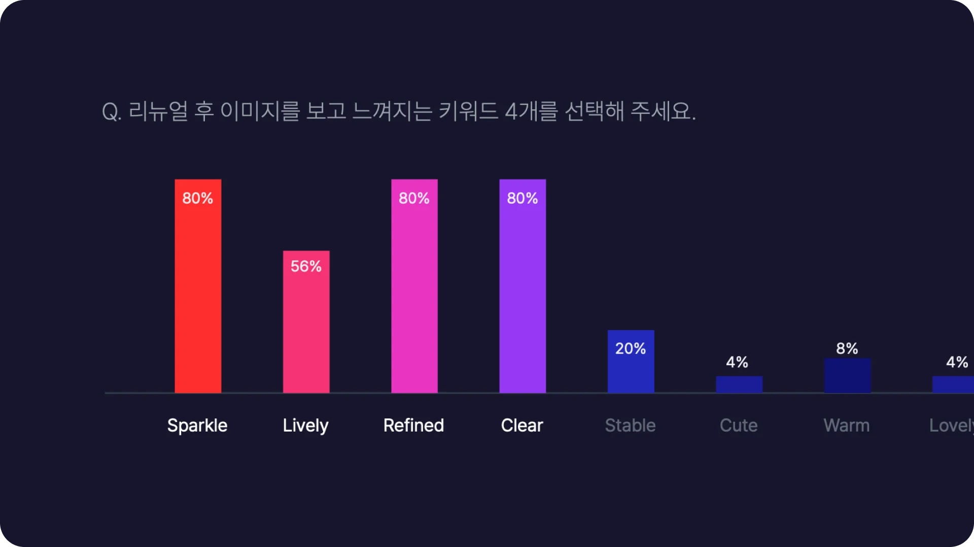 설문은 리브랜딩 전후 대표 이미지들을 제공하고, 각각 어떤 인상이 남는지 키워드를 묻는 방식으로 진행되었습니다. 리브랜딩은 Sparkle, Lively, Refined, Clear라는 방향성을 가지고 디벨롭되었습니다. 고객들이 디자인 방향성을 인지할 수 있는지 확인하기 위해, 위 이미지를 제시하고 관련된 키워드를 고르는 문항을 만들었습니다. 그리고 해당 키워드를 선택한 이유와 연상되는 브랜드 퍼스널리티에 대해 자유롭게 기술하도록 요청했어요.