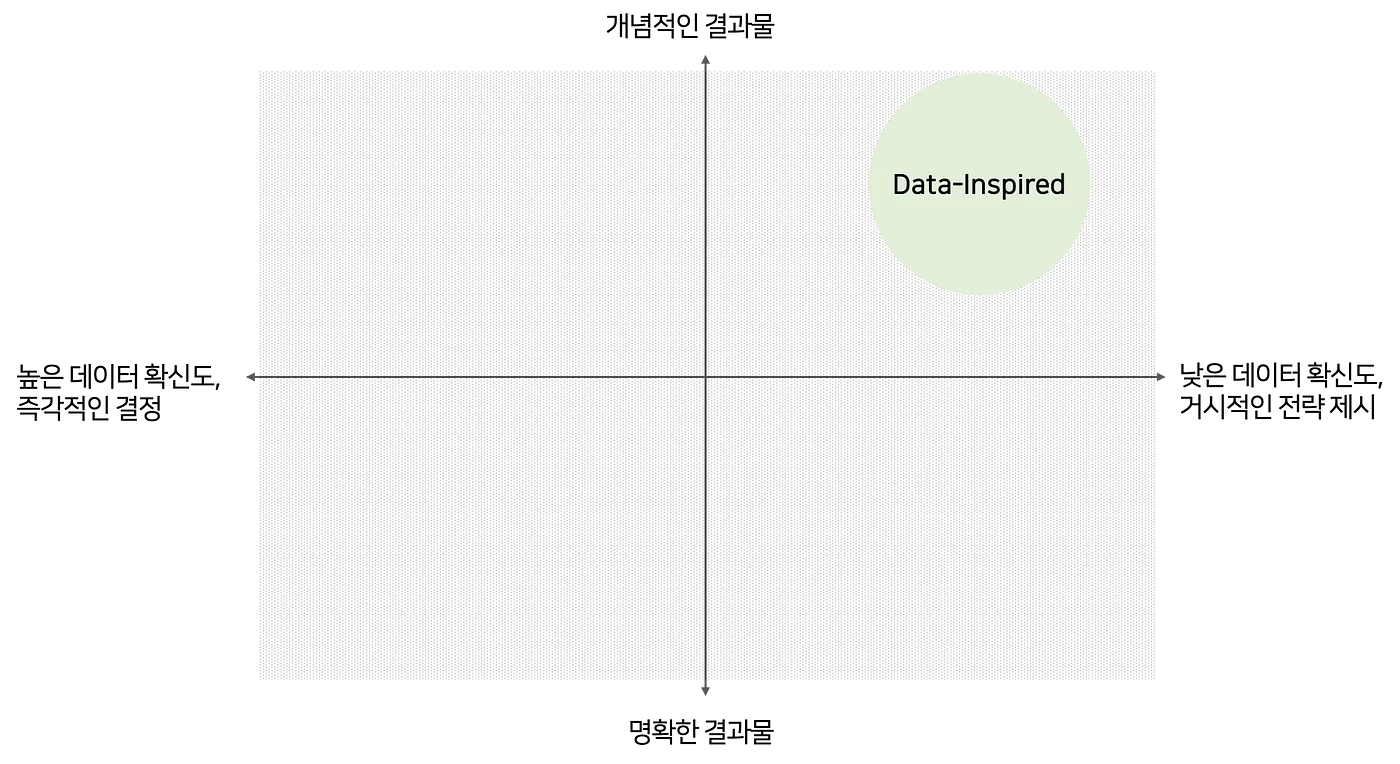 Data-inspired는 탐구적인 성격의 접근법입니다. 명확한 결과나 성과물을 딱히 기대하지 않으며, 오히려 다양한 출처를 통해 수집된 데이터의 집합 속에서 패턴과 의미를 발굴하여 문제해결에 필요한 새로운 영감을 얻는 것이 Data-inspired 접근법의 핵심입니다. Data-inspired 접근법을 취하는 사람은 엄격한 통계적, 수치적 근거 대신, 직관과 경험을 통해 축적된 통찰력이 바탕이 되어 움직일 수 있어야 합니다.