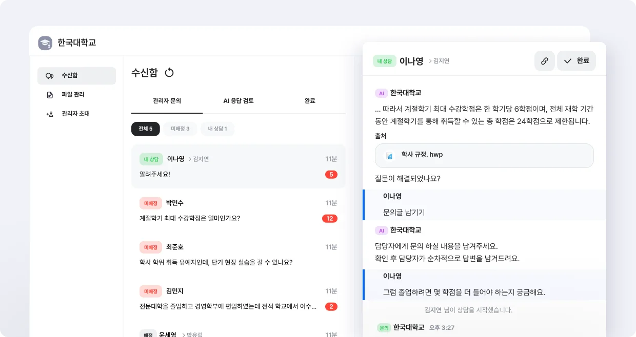 AI 상담 솔루션, 커넥트는 RAG 기반의 AI 문의 상담 시스템입니다. 반복적이거나 학칙 등 규정에 기반하여 답변할 수 있는 문의들을 AI가 자동으로 처리해 줌으로써 담당자분들이 상담 외 본업에 더 집중할 수 있도록 도와주는 역할을 하고 있습니다. 학교가 가지고 있는 데이터 소스를 활용해 답변하도록 하는 검색 증강 생성 기술과 답변 출처를 함께 표시하는 장치를 통해 할루시네이션으로 인한 문제를 사전에 방지하는 것이 가장 큰 특징입니다. 주로 대학에서 사용하고 있으며 서비스 시작 반년 만에 전국의 대학을 대상으로 도입이 확산되고 있습니다.