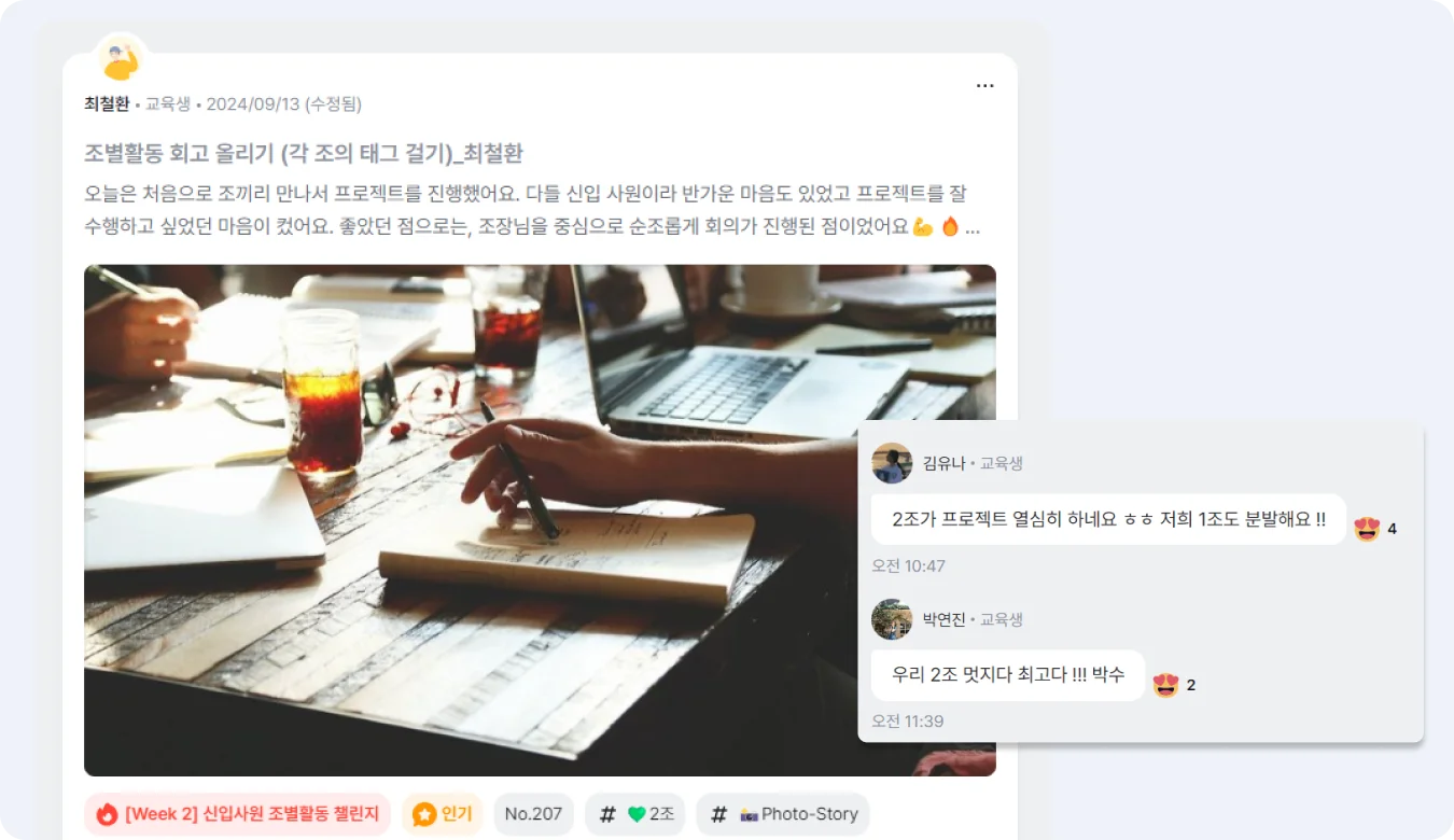 [STEP 1] 커뮤니티에 조별 활동 과정과 사진을 공유하도록 해보세요. 서로에게 자극이 되어 더 좋은 결과물을 도출할 수 있어요. 조별 활동 과정들이 한 공간에 기록되고, 담당자는 별도로 활동 인증 내역을 받지 않아도 됩니다. [STEP 2] 과제 기능을 활용하여 ([콘텐츠] 탭 > 과제) 조별 활동 과제물을 제출받으세요. 제출한 과제에 바로 피드백을 남길 수 있고, 과제 파일 일괄다운로드도 가능합니다.
