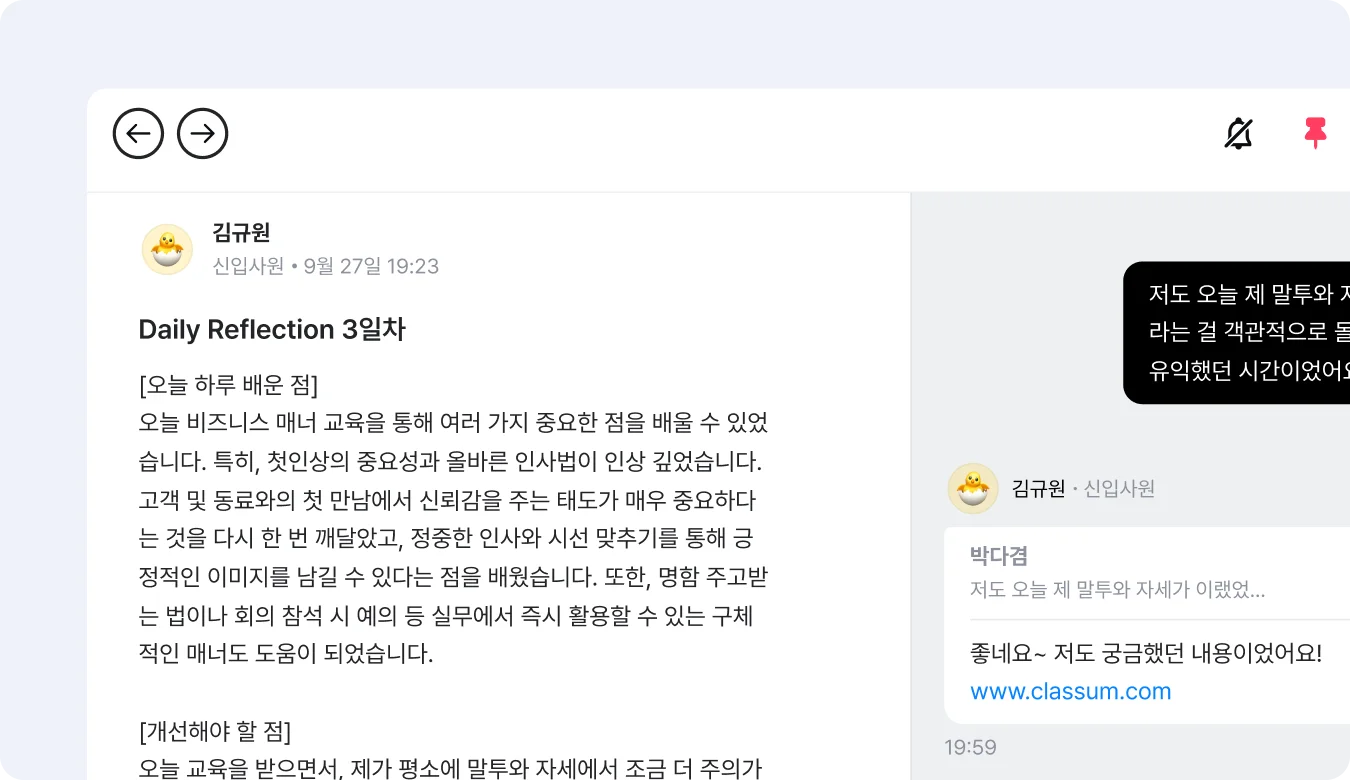 온보딩 기간 동안 입사자들이 하루 업무가 끝날 때 리뷰를 쓰도록 유도해 보세요. 업무와 온보딩 교육을 통해서 새롭게 배운 점과 개선할 부분들을 정리해 공유하면 자연스레 동료들과 피드백을 주고받게 됩니다. 피드백은 성장을 위한 인사이트가 될 수도 있고 성공적인 온보딩을 독려하는 응원의 말이 되기도 합니다. 매주 베스트 리뷰를 선정해 공지와 함께 리워드를 제공하는 방식으로 운영하면 더 많은 참여를 이끌어낼 수 있습니다.
