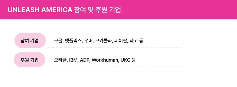 UNLEASH AMERICA는 HR/Tech 트렌드와 최신 뉴스, 전 세계 기업 교육, 인재 관리 리더의 소식을 전하는 디지털 미디어 그룹 UNLEASH가 주최합니다. UNLEASH는 2011년부터 지금까지 UNLEASH AMERICA와 UNLEASH WORLD로 나눠 연 2회 HR 콘퍼런스를 개최하고 있어요.