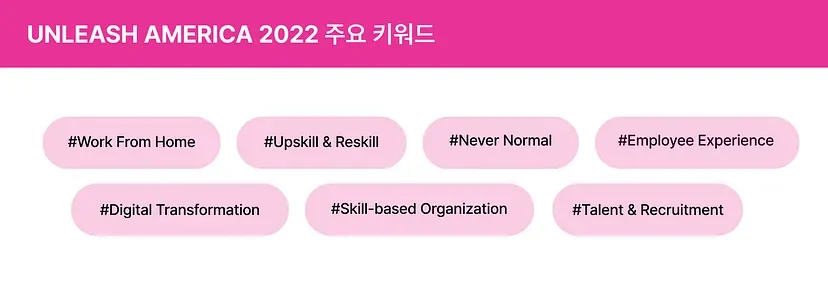 UNLEASH AMERICA 2022의 주요 키워드입니다. 특히 ‘Work From Home’은 최근 한국에서도 다양한 이야기가 오가는 주제인데요. 얼마 전 국내 대기업들이 엔데믹 시대의 근무제를 발표하며 화제였죠. 엔데믹의 초입에서 구성원들의 각기 다른 의견을 모아 근무제를 운영하는 것 역시 인사 담당자의 역할인 만큼 이번 콘퍼런스에서 펼쳐진 논의의 장이 더 의미 있게 다가왔습니다.